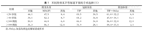 目前国内常用的尿道下裂手术方式包括MAGPI、TIP、Duckett及分期手术。医生的年龄(50岁为界)及每年手术量(100例)对无阴茎下弯的尿道下裂手术选择的影响差异无统计学意义。