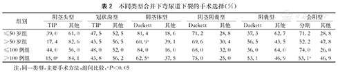 鉴于手术的选择可能会因为每年手术量和医生年龄而不同,我们把收集到的数据进行分组,每年手术量≤100例的一组(50人),>100例的一组(32人)。根据手术医生年龄分为≤50岁一组(59人),>50岁一组(23人)。