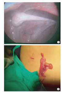 74例均予以行性腺探查术。术后病理结果如下:双侧性腺均为卵睾25例(33.78%)(图1为腹腔镜下所见;图2为腹腔镜联合开放手术所见);一侧性腺为卵巢,一侧为睾丸13例(17.57%);一侧卵睾,一侧睾丸12例(16.22%);一侧卵睾,一侧卵巢18例(24.32%);双侧均为原始性腺2例(2.7%);一侧原始性腺,一侧卵巢2例(2.7%);一侧原始性腺,一侧睾丸2例(2.7%)。31例含有卵巢性腺患儿中14例卵巢分布在左侧,占45.16%。25例含有睾丸性腺的患儿中11例睾丸位于右侧,占44%。