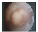 进行关节镜下切除时,应尽可能的将瘤体全部切除。在发现完全与周围组织无连续性的游离瘤体时,应暂时关闭关节镜的入水阀门,在生理盐水非流动状态下清除游离的肿瘤组织更容易。应仔细寻找和观察瘤体与周围组织连接的蒂部,使用篮钳、刨刀等将其完整切除。术中应积极使用射频气化进行创面止血,预防术后关节血肿的发生。在瘤体切除后,还要对关节腔进行再次仔细观察,以避免残留。手术完成后,要对关节腔进行充分冲洗,清除游离组织碎屑。对肿瘤进行镜下的充分观察后,如果预计关节镜下很难彻底切除瘤体全部,则应毫不犹豫的改为切开手术。因此,术前应对患儿说明有可能改为关节切开手术,同时也应准备好相应的手术器械。