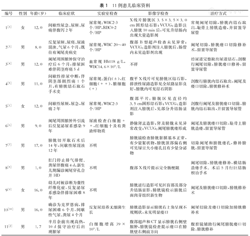 查阅1985年2月至2014年5月间发表的关于儿童阑尾膀胱瘘的文献,具体检索华中科技大学同济医学院图书馆网页PUBMED、MEDLINE、BIOSIS Previews、EMBASE及The Cochrane Library等数据库,检索词为"Children/Pediatric appendicovesical fistula";检索华中科技大学同济医学院图书馆网页中文期刊全文数据库(CNKI)、中国生物医学期刊文献数据库(CMCC)和万方医学等数据库,检索词为"儿童/小儿阑尾膀胱瘘"。共获取11例患儿纳入本研究,其中男8例,女3例,平均年龄10.5(1.0~17.0)岁,现将11例患儿临床资料、实验室检测、影像学检查、治疗情况等情况归纳入表1。