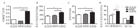 SIS组和真皮组术后的开始进食时间分别是(186.5±37.7)h、(173.3±41.5)h,显著少于对照组开始进食时间(256.1±41.8)h,(P<0.05);但SIS组与真皮组之间的开始进食时间差异无统计学意义(P>0.05)。