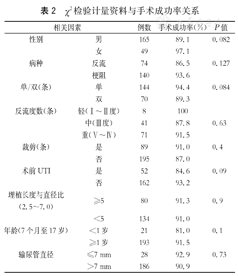 | 相关因素 | 例数 | 手术成功率(%) | P值 | |