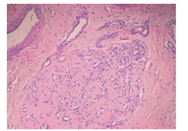 瘤组织常发生在真皮层和/或皮下组织,呈小叶状结构,小叶大小不等、形状不一,由大量微血管组成,微血管大小不一、形状不规则,腔内衬以内皮细胞。内皮细胞胞质常不明显,核突出,似"靴钉样"(图2)。小叶中央见星形管腔,管壁厚薄不一。间质为致密纤维组织,可见淋巴管及明显的小动静脉。核分裂象少见。可见肥大细胞数量增多[11]。而RICH与NICH相比,同样的小叶状结构内可见多量的血管闭锁、纤维化,余血管腔狭窄(图3),内皮细胞扁平,核不突出,间质见更多的纤维脂肪组织,血栓、含铁血黄素沉着、灶性钙化可见。
