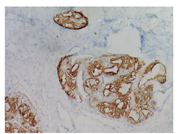 Glut1在IH的各个时期均有表达,而各型CH均不表达[12],是CH与IH鉴别的重要工具。最近研究显示WT1(Wilms Tumor 1)在内皮增生的脉管肿瘤内阳性表达,而脉管畸形中除动静脉畸形增生期表达外其余类型的脉管畸形不表达[13],是鉴别脉管肿瘤与绝大多数脉管畸形的有效工具。本组病例WT1均呈阳性表达,且表达部位在胞浆(图4),与文献报道相一致。D2-40是淋巴管内皮细胞特异性标志,由于CH瘤组织内散在淋巴管结构,因此可见血管小叶边缘阳性而小叶内阴性的形态特征,可作为诊断的参考指标。