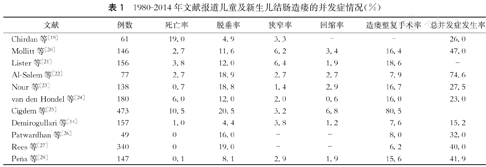 尽管新生儿结肠造瘘术是拯救生命的手术,但手术对象往往早产、低体重、有合并畸形,围手术期管理要求高,易发生并发症,死亡也不少见。常见并发症包括:肠管脱垂、回缩、狭窄,伤口裂开及感染,术后败血症,肠壁分开或者穿孔,黏膜脱落或出血,粪便渗漏引起造口周围皮肤红疹、感染、糜烂和切口裂开,小肠疝入造口与腹壁固定的缝隙形成造瘘口周围疝,远端肠管吸收尿液导致酸中毒和远端肠管大便嵌塞等[6]。发达国家如美国的结肠造口并发症可高达32%[1]。表1是从1980-2014年文献报道儿童及新生儿结肠造瘘的并发症情况,涵盖发达国家和发展中国家。