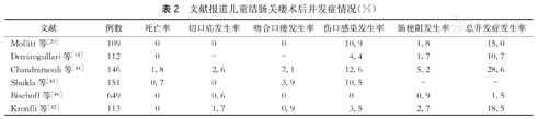 文献报道儿童结肠关瘘术后并发症情况(%)