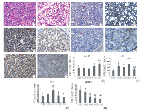 选取每个组织蜡块的2~6号切片。60 ℃恒温烤箱烤片4 h,二甲苯脱蜡,梯度乙醇至水,3%H2O2灭活阻断内源性过氧化物酶,柠檬酸盐缓冲液煮沸高压热修复法修复抗原,滴加一抗(2号片为Glut-1、3号片为Col-Ⅳ、4号片为LN、5号片为FN、6号片为MMP-9),4 ℃孵育过夜。滴加二抗,孵育30 min。DAB显色,苏木素复染核,盐酸酒精分化,无水乙醇脱水,二甲苯透明,中性树胶封片。以PBS液代替一抗作为阴性对照,已知的阳性组织作为阳性对照,Glut-1以细胞内着色为阳性,Col-Ⅳ、LN、FN和MMP-9以细胞质和(或)细胞外基质中出现棕黄色为阳性反应,不着色为阴性。
