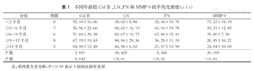 不同年龄段Col-Ⅳ、LN、FN和MMP-9的平均光密度(