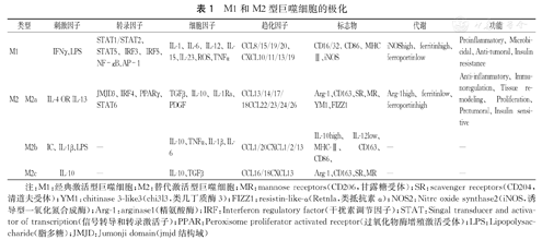 巨噬细胞在不同的微环境经不同的刺激因子诱导可发生差异性的活化,分化为具有不同功能表型的亚型,而发挥不同的生物学功能。根据极化后细胞表面标示性分子及功能的不同,巨噬细胞主要分为两种类型:经典激活型巨噬细胞(classically activated macrophage ,M1型)和替代激活型巨噬细胞(alternatively activated macrophage,M2型)[1,5]。巨噬细胞极化的过程是可逆的,M1型和M2型只是极化过程中的两个极端,巨噬细胞可存在于这一极化过程中的任何状态,但巨噬细胞极化的具体机制仍不完全清楚[6,7,8]。(表1)