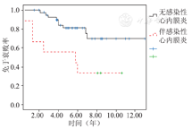 术后1、3、5、7年BJVC免于衰败率分别为98.0%(50/51)、86.3%(44/51)、78.4%(40/51)和70.6%(36/51)(图1)。未发生感染性心内膜炎42例中,术后2、5、7年带瓣外管道免于衰败率分别为97.6%(41/42)、83.3%(35/42)和78.6%(33/42);发生感染性心内膜炎9例中,术后2、5、7年带瓣外管道免于衰败率分别为66.7%(6/9)、55.6%(5/9)和33.3%(3/9)(图2)。其中2例接受了外科手术更换了外管道,4例接受了心导管球囊扩张,球囊扩张后随访心脏超声狭窄得到了明显改善,其余仍在随访中。