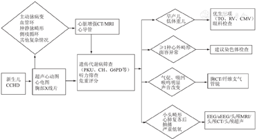 此类新生儿转运至心脏监护室后,由于病情危重,生命体征不稳定,部分患儿需急诊或限期行心脏手术治疗,术前可能难以完成常规筛查和合并畸形及脏器功能检查,可在病情稳定后进行或建议出院后至相应科室进一步评估。合并肢体或外观畸形,如唇腭裂、多指(趾)等,易早期识别并告知家属。但还有大量外观"正常"的患儿,除心脏畸形外,还可能存在未检出的出生缺陷如先天性脑血管畸形、智力障碍、酶缺乏、免疫缺陷及内部器官畸形等。多发畸形的患儿整体治疗预后及长期生存质量较差,临床需提高警惕[26]。