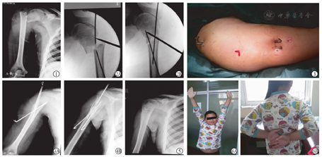 典型病例:患儿,女,12岁,从高处摔下致右肱骨外科颈骨折,Neer-Horwitz IV型。伤后5d行经皮撬拨复位闭合克氏针固定。(图1、图2、图3、图4、图5、图6)