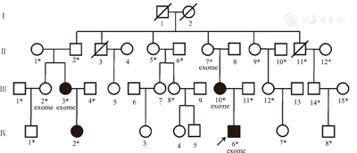 注:黑色填满:DDH患者;反斜线标记:已经去逝的家系成员;*:能获得DNA样本的家系内成员;exome:进行全外显子测序分析的家系内成员;箭头:先证者
