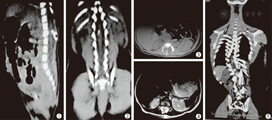 术前X线及CT检查发现脊柱畸形184例,其中椎管内骨嵴172例,椎管闭合不全162例(72%),椎板融合畸形24例(10.7%),半椎体及蝴蝶椎畸形62例(27.6%)。全脊髓MRI检查发现所有患儿均有不同程度的脊髓低位、栓系。其中腰骶部脊髓脊膜膨出33例(14.7%),腰骶部脂肪瘤46例(20.4%),脊髓空洞症175例(77.8%),骶管囊肿18例(8%)。典型病例图片见图1,图2,图3,图4,图5。