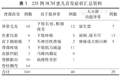 | 背部改变 | 例数 | 双下肢异常 | 例数 | 大小便功能异常 | 例数 |