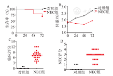 NEC模型组36只新生小鼠,对照组11只新生小鼠。NEC模型组24 h之内死亡1只,48 h存活率为81%,72 h存活率为69%。对照组存活率为100%(图1A)。24 h内死亡的新生鼠,不能归因于NEC,因为24 h内不产生NEC样肠道病理改变。可能是因为围产期并发症造成,如呼吸窘迫综合征,窒息,呼吸道感染等[6]。所以24 h内发生的死亡在生存分析中用作截尾数据,不纳入最终的NEC成模率计算。