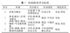 | 1 | 体重减轻,活泼/无脱水 | 对轻微刺激有反应 | 倦怠/可活动 | 灰色 |