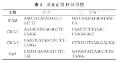 采用荧光定量PCR法测定新生小鼠肠道细胞中ICAM、CXCL-1、CXCL-2炎症相关mRNA和肠道干细胞标记物Lgr5表达变化(表3)。小鼠肠道组织总RNA的提取根据OMEGA E.Z.N.A.Total RNA Kit说明书进行,微量分光光度计检测RNA纯度和浓度。cDNA合成参考PrimeScript RT reagent Kit with gDNA Eraser说明书进行。荧光定量PCR以β-actin作为内参对照,单个样品均作3孔重复以减少实验误差。