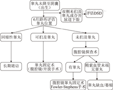 若发现患侧睾丸未扪及,但健侧睾丸较正常同龄儿睾丸增大的情况,常提示患侧睾丸缺如或萎缩[6]。由于该体征缺乏诊断特异性,不能因此而否定外科探查必要性。腹股沟区未扪及睾丸,需仔细检查耻骨区、股部、会阴部以除外异位睾丸。最常见的异位睾丸位于Denis-Browne小窝(即腹外斜筋膜与Scarpa筋膜间的浅表小窝)。诊断性腹腔镜检查是确定腹腔内隐睾、睾丸缺如或萎缩的可靠手段。麻醉状态下再次进行体检,部分最初未触及的睾丸此时可扪及。探查精索血管盲端未见睾丸组织是睾丸缺如的诊断依据;若精索血管末端见囊皮样组织而无睾丸实质,则为睾丸萎缩。双侧未扪及睾丸或任何提示性分化异常的情况(如合并尿道下裂),均需尽早进行内分泌检查和遗传评估[7,8,9]。