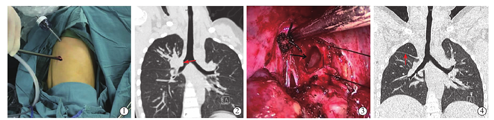 儿童患者血管、气管及肺组织均较细小,大龄儿童可使用成人器械,处理上与成人无异,对于低龄儿童,成人胸腔镜器械如直线切割缝合器并不适用[10,18]。对于该类患儿,处理血管时我们使用Hemolock夹闭,一般近心端使用2个Hemolock夹闭,远心端使用1个Hemolock夹闭,然后超声刀或组织剪切断血管,或直接用丝线结扎后切断血管。肺隔离症患儿的血管直接从主动脉发出,多数长期肺部感染,血管壁较脆弱,且多数合并有周围组织粘连,处理困难,一旦血管破裂出血量大,控制困难。我们的经验是,处理供血动脉时尽量稍远离主动脉,即便出现出血也有足够长的残端可以控制出血,保证手术安全。低龄儿童气管的处理则直接切断后用proline线连续或间断缝合残端;肺裂发育不完全时,较厚的组织使用直线切割缝合器处理即可,较薄的组织则用超声刀或电钩直接切断,术后并不会增加漏气风险。袖式切除时动脉、静脉、叶裂的处理与常规肺叶处理一致,处理气管时一般使用组织剪切断肺叶气管及部分主气管,保留主气管与中间支气管膜部,用以保证主气管与中间支气管的方向不会扭曲。缝合前充分吸尽气管内分泌物与积血,尽量不要使用电钩等器械止血,以免影响残端血供。一般采用间断缝合技术,吻合后嘱麻醉师利用支气管镜观察吻合口并吸尽气管内分泌物及积血,鼓肺确认无吻合口瘘,残肺能轻易复张则可结束手术。本研究中2例行右上肺袖式切除患儿术后第1天拔除气管导管,术后复查胸部CT,右中下肺复张良好(图4),术后1年复查未见肿瘤复发。