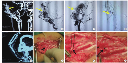 笔者认为,根据形态的分型将更有助于治疗方式的选择,Ⅰ型病变可以采用外科手术治疗,但必须明确瘘管数量及位置,通过手术彻底结扎或切除瘘管,才能达到根治的效果。本组中右侧腋动静脉畸形患儿,通过反复多次彩超探查及CTA检测,明确瘘口单一,位于右侧腋动脉,行单纯瘘管结扎术,疗效显著。Ⅱ型及Ⅲ型病变,由于交通支丰富,外科手术难度大,可选择手术与血管腔内介入联合治疗。