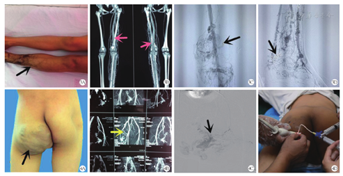 | 1 | 男 | 12 | 左手拇指肿块渐大 | 桡动脉分支栓塞+畸形静脉硬化 |