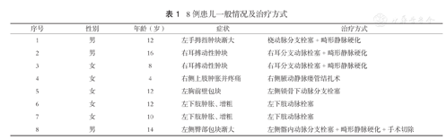 | 8 | 男 | 14 | 左侧臀部包块渐大 | 左侧髂内动脉分支栓塞+畸形静脉硬化+手术切除 |