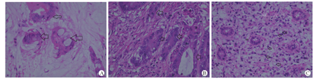 本组病例病理特征见表1。①肿瘤部位:结肠5例,以横结肠多见,直肠1例。②病理诊断:黏液腺癌2例,印戒细胞癌3例,管状腺癌1例,均有区域性淋巴结转移(图1A, 图1B, 图1C)。20 ~ 30岁组以管状腺癌及低分化型为主,而50 ~ 60岁年龄组则以管状腺癌为主(表2)。③病理中还发现1例横结肠肿瘤同时存在有肠壁肠神经元发育异常,例6自2岁起有典型便秘史。④例2十年前曾在外院做肝母细胞瘤切除术,术后常规辅以化疗,此次为二次肿瘤。