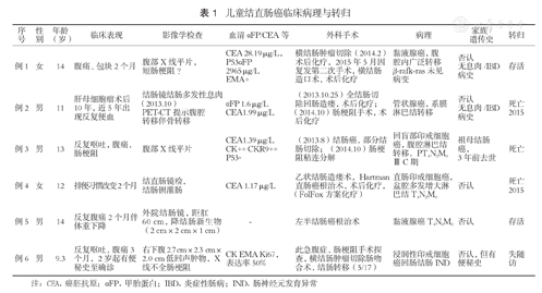 | 例1 | 女 | 14 | 腹痛、包块2个月 | 腹部X线平片,短肠梗阻? | CEA 28.19μg/L,P53¦ÁFP 2965μg/LEMA+ | 横结肠肿瘤切除(2014.2)术后化疗,2015年5月因复发第二次手术,横结肠造口术,术后化疗 | 黏液腺癌,腹腔内广泛转移¦Â-rafk-ras未见病变 | 否认无息肉/IBD病史 | 存活 |