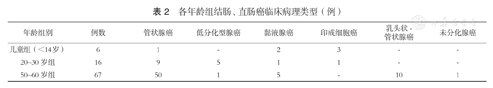临床表现以腹痛、便血、腹部肿块、肠梗阻为主,1例有大便习性改变。病理特征:肿瘤部位在结肠5例,直肠1例。病理诊断:结肠黏液腺癌2例,印戒细胞癌3例,管状腺癌1例,均有区域性淋巴结转移,1例远处转移。病理检查中还发现1例合并肠神经元发育异常改变(例6)。例2十年前曾做肝母细胞瘤切除,辅以化疗,此为二次肿瘤。6例儿童均予以化疗,至随访日(2016年8月30日)有3例死亡,1例失随访,2例存活,继续化疗中。后者生活质量低于同龄儿童。对照20 ~ 30岁年龄组,与50 ~ 60岁年龄组,后二组临床表现则以大便习性改变为主。从病理特征分析,20 ~ 30岁组以管状腺癌、低分化腺癌、印戒细胞癌、黏液腺癌(以多少排序)多见,50 ~ 60岁组以管状腺癌、黏液腺癌、乳头状管状腺癌、低分化腺癌、未分化癌(以多少排序)多见。