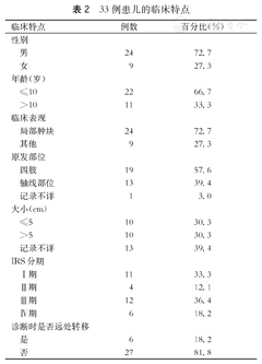 入组患儿为2008年1月至2014年11月在重庆医科大学附属儿童医院、上海交通大学附属上海儿童医学中心、首都医科大学附属北京儿童医院、中山大学附属肿瘤医院收治的滑膜肉瘤患儿33例。其中,男24例,女9例,中位年龄8.0岁(4个月至16岁)。