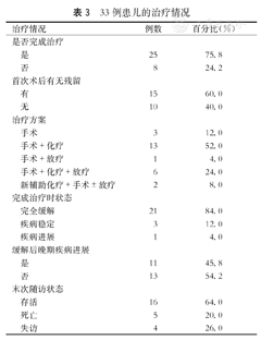 回顾性分析2008年1月至2014年11月重庆医科大学附属儿童医院、上海交通大学附属上海儿童医学中心、中山大学附属肿瘤医院、首都医科大学附属北京儿童医院4家医院收治的33例滑膜肉瘤患儿的临床资料和治疗情况,并进行预后分析。