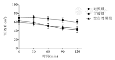 取近回盲部结肠组织,约2 cm。将每个标本沿肠系膜缘打开,然后用预冷的生理盐水冲洗并保存于预充有(95%O2-5%CO2)气体的生理盐水中,然后固定在尤氏室上。准备标本安装在6通道Ussing chmber系统(Physiologic Instruments,USA),孔面积0.031 cm2。然后,将5 ml Manital-Krebs缓冲液加入到黏膜侧,同时加入5 ml的Glucose-Krebs缓冲液加入浆膜侧。通过使用循环水将尤氏系统保持在37℃的恒定温度。系统稳定10 min后,连续记录每个样品的跨上皮电阻(transepithelial electrical resistance,TER)值120 min。