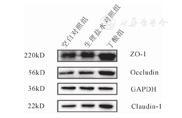 紧密连接蛋白Claudin-1、Occludin和ZO-1的表达情况,以各目的蛋白条带的灰度值与对应的内参照(GAPDH)的灰度值比值视为目标蛋白的表达水平。