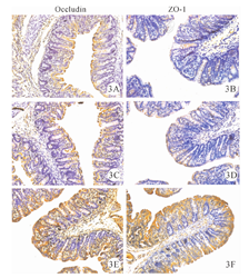 新鲜回盲部标本4%甲醛固定,石蜡包埋,垂直肠管长轴切成4 μm厚的连续切片。将上述组织石蜡切片常规烘烤、二甲苯脱蜡及梯度酒精脱水待用。将切片浸泡于0.01 mol/L的柠檬酸盐缓冲液(pH 6.0)中,在压力锅内加热至沸腾(10 min)修复抗原,室温冷却20 min。3% H2O2阻断内源性过氧化物酶,山羊血清封闭非特异性抗原(30 min),拭去血清。PBS清洗3次,每次5 min后加一抗(多克隆兔抗ZO-1,Occludin 1∶200),4℃冰箱下孵育过夜。第2天室温下复温20 min,加二抗(生物素标记的山羊抗兔IgG)室温孵育20 min。DAB液显色,显微镜下观察染色情况适时终止。苏木素复染,用0.1% HCl分化,自来水冲洗蓝。最后切片经脱水、透明后中性树胶封固,显微镜下观察。