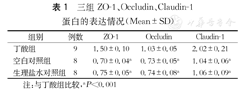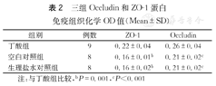 三组Occludin和ZO-1蛋白免疫组织化学OD值(Mean±SD)