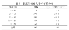 BA患儿手术时年龄为(73.4±24.6)d,从历年平均手术年龄来看,多年来胆道闭锁的手术年龄并未明显下降(图2)。从手术年龄分布来看,基本集中在31~90d年龄段。极少部分患儿(1.1%)在新生儿期即接受Kasai手术,但是仍然有229例(19%)患儿手术年龄超过90d(表1)。