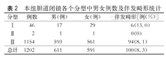 1 202例BA病理分型如下:Ⅰ型,胆总管闭锁,46例(3.8%);Ⅱ型,肝管闭锁,2例(0.1%);Ⅲ型,肝门部闭锁,1154例(96.0%)。Ⅰ型BA中,女多于男,13.0%伴发畸形。Ⅱ型BA数量较少,仅2例,男女各1例,无伴发畸形。Ⅲ型BA中,男略多于女,8.1%伴发畸形(表2)。