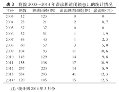 根据IOC结果,近十年来有119例排除胆道闭锁。分析2003~2014年误诊的比例发现,随着我院每年收治胆道闭锁的例数增加,每年接受不必要术中探查的比例基本持平,约在10%左右波动(表3)。