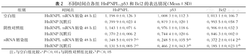 siRNA转染组HnPNPL、p53和Bcl2的mRNA表达水平低于空白组及阴性对照组,组间比较,差异有统计学意义(P<0.01和0.05,表2)。空白组与阴性对照组比较,差异无统计学意义(P>0.05,表2)。