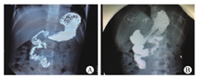 19例于术后1个月内症状明显缓解,但随后随访中发现部分患儿症状反复。术后3个月、6个月、1年和2年因腹痛或呕吐等症状复发再次入院的例数和入院次数[例数(次数)]分别为6例(6次),8例(8次)、10例(12次)和10例(12次),经禁食、补液、制酸和护胃等保守治疗均好转出院。术后1个月常规门诊复查上消化道造影,均显示吻合口通畅、无漏(图1A、图1B),术前2例合并消化道溃疡的患儿复查胃镜均提示溃疡面积减小。目前随访2个月至2年4个月,平均11个月,仅1例患儿发生吻合口狭窄,无吻合口漏,粘连性肠梗阻发生,除2例疗效不佳外(其中1例为吻合口狭窄),余20例均有好转,其中13例症状明显缓解(随访时间超过6个月无临床症状或虽有症状但较术前明显改善),7例部分缓解(随访时间不足半年,但无临床症状或自觉临床症状减轻),有效率90.9%。