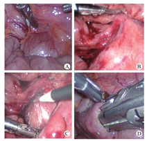手术技巧对预后至关重要,我们的体会是:①合理布局操作孔,通常3孔法即可完成操作,脐部为观察孔,左中上腹为切割闭合器操作孔,须使用12 mm穿刺器;②寻找十二指肠水平部通常并不困难,将横结肠上翻,透过其系膜根部左侧半透明的无血管区即可看见十二指肠水平部(图2A),但部分患儿病史较长,由于肠系膜增厚及局部淋巴结增生、肿大粘连遮挡半透明的肠系膜,导致寻找困难甚至将胃当作十二指肠游离;本组1例腹痛反复发作7年的患儿存在类似情况(图2B),按常规方法反复寻找无果,最后将肿大淋巴结表面系膜切开,松解切除部分淋巴结后才发现(图2C);③对十二指肠的松解必须充分,包括前后壁及侧壁,近端要达降部,远端尽量靠近压迫梗阻的部位,避免副损伤,尤其是十二指肠水平部后外侧的下腔静脉及内侧的肠系膜上动静脉,降部松解不全可能会导致切割闭合器进入受阻,易引起肠壁浆肌层撕裂;④为吻合方便,将待吻合空肠与十二指肠远近端各浆肌层缝合固定,打结后靠拢,近端将线尾留置于腹壁外用于牵引,有利于协助切割闭合器进入肠管;⑤切割闭合器进入肠壁的切口不宜过大,一般0.8~1.0 cm即可,空肠段通常进闭合器钉仓端,切口需略大(1.0 cm),若切口过小强行进入容易造成肠壁浆肌层撕裂,且两孔间距离不宜过大(<1.5 cm为宜),否则可导致吻合困难;⑥闭合器一般选用白色钉仓,白钉钉长较短,闭合紧密,可大大减少术后吻合口渗血(图2D);⑦闭合前要确保夹闭的两段肠管间无系膜或腹膜等其他组织,闭合后要检查吻合口情况;⑧输入襻空肠盲端不宜过长,一般取12~15 cm,保证吻合口无张力;⑨应用4-0可吸收倒刺线缝合关闭吻合口缺口,采用连线缝合法,头针自上而下连续全层缝合,注意进针边距,不要内翻过多,收紧缝线后,再将穿出肠腔外的缝针由下而上行浆肌层缝合加固,倒刺线具有对合严密、收紧后线不回退、可吸收、异物反应少、无须打结等优点;⑩切割闭合器吻合可靠、出血少、可节省手术时间、简化手术程序、闭合后的吻合口较大,符合本术式要求值得在本术式中推广应用。