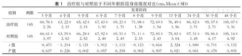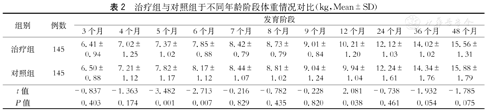 在4岁(48个月)时治疗组患儿身高为(105.07±3.36)cm,体重为(15.56±1.31)kg;对照组患儿身高为(105.14±4.92)cm,体重为(15.88±1.79)kg。经统计学分析,治疗组与对照组各年龄段之间身高、体重比较差异无明显统计学意义(P>0.05)。