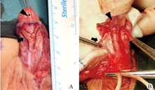 术中观察尿道板周围尿道海绵体外观,多数远端型海绵体形态饱满、颜色鲜红,而多数近端型海绵体形态扁平,颜色苍白(图1)。海绵体的分叉点位于尿道开口近端,分叉后海绵体向远端走行于尿道板深面和两侧。通过比较海绵体分叉处平均宽度来判断海绵体发育情况,远端型尿道下裂尿道板两侧尿道海绵体宽度值为(0.36±0.12)cm,近端为(0.18±0.10)cm,远端型明显宽于近端型(P<0.05),说明远端型海绵体发育较好。