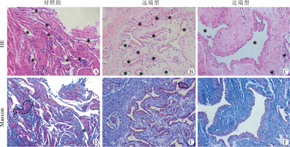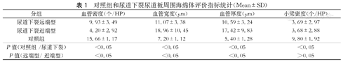 尿道板两侧尿道海绵体和正常对照组尿道海绵体结构上存在差异(图2)。对照组标本海绵体结构一致,均呈现典型的"海绵样"外观:海绵窦血管致密、腔隙狭长、血管壁薄、存在相互沟通。尿道下裂组海绵体结构均发生改变:海绵窦排列松散、腔隙变宽大、血管壁增厚、海绵窦相互沟通减少。另外对照组存在海绵体小梁结构,尿道下裂组海绵体小梁减少。评估对照组和尿道下裂组海绵体海绵窦结构变化(表1),对照组和全部尿道下裂相比,四类指标均存在明显差异。近端组和远端组比较,近端组的海绵体变异程度比远端组明显。