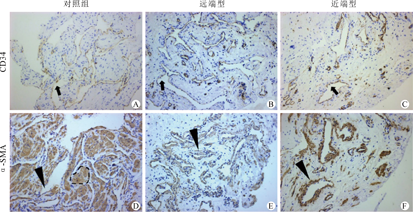 进一步利用CD34标记血管内皮、α-SMA标记血管平滑肌,研究尿道板两侧海绵体海绵窦血管壁增厚的成分,发现尿道下裂组和对照组中,CD34阳性细胞均单层贴附在血管管腔的内侧壁,血管内皮层厚度没有明显差异;而尿道下裂组比对照组的α-SMA阳性细胞层明显变厚(图3),提示尿道下裂组中海绵窦的血管壁增厚主要由血管壁肌层增厚造成。