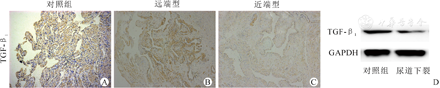 远端型尿道下裂尿道板周围海绵体的宽度与近端型相比显著增宽[远端为(0.36±0.12)cm,近端为(0.18±0.10)cm,P<0.05]。组织学和血管组化结果提示尿道下裂尿道板周围尿道海绵体海绵窦结构异常,表现为血管腔隙宽大[对照组(7.20±1.12)μm,尿道下裂组(13.75±8.08)μm,P<0.05]、血管壁增厚[对照组(5.40±1.28)μm,尿道下裂组为(14.11±7.59)μm,P<0.05]、海绵窦血管密度减少(尿道下裂组为15.66±1.17,对照组为7.24±4.19,P<0.05)及海绵体小梁密度减少(尿道下裂组为9.80±1.92,对照组为3.68±2.87,P<0.05),尿道下裂中近端组较远端组结构变异程度明显。同时免疫组化结果提示尿道下裂尿道海绵体间质TGF-β1表达降低(P<0.05),免疫印迹和qRT-PCR结果同样显示近端型尿道下裂海绵体TGF-β1表达降低(均P<0.05)。