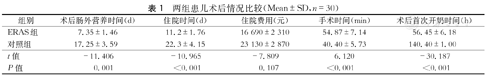 ERAS组注重术中液体管理,血糖管理和体温控制。具体方案:①术中限液,采用输液泵按6~8 ml·kg-1·h。-1控制输液速度,同时将输入液体加热至36℃~37℃。②术中保暖,采用加温床或循环水服加温系统,维持患儿核心温度不低于36℃。③术中血糖管理,调节患儿的糖速在6~10 mg·kg-1·min-1,维持患儿的血糖水平在4.5~5.5 mmol/L。对照组按传统术中管理进行。