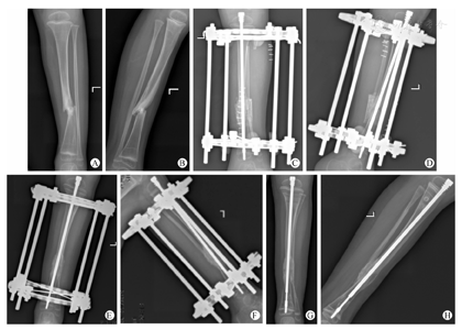 术后预防性使用抗生素48 h,术后7 d及出院后每2个月,拍摄胫骨正侧位X线片。胫骨假关节愈合后拆除伊氏架外固定器行长腿管型石膏固定2个月,拆除石膏后,佩戴膝-踝-足支具,此时患肢可负重行走。患儿在任何时候均应戴支具,包括睡觉时,只在洗澡时取下支具。带支具时允许参加一般的体育运动。